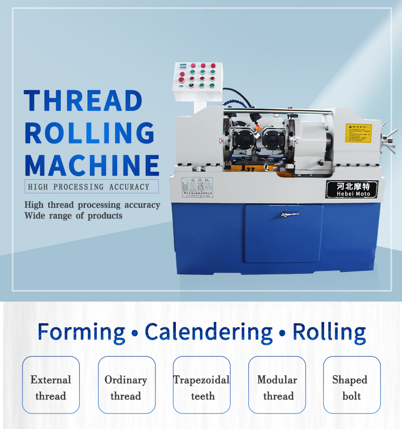 Hebei Moto Machinery Trading Co., Ltd. is a professional manufacturer of more than 30 varieties of 8 major series such as thread rolling machines, reducing machines, construction screw machines, mine bolt machines, rolling machines, mirror rolling machines, tooth rolling machines Large high-tech enterprise. Its advanced technology, sophisticated equipment, first-class products, and also has a perfect quality assurance after-sales service system. The products are also exported to various countries and regions in the world many times, and are well received by customers at home and abroad. Here, We willing to work together with global customers to develop together and create a better tomorrow.