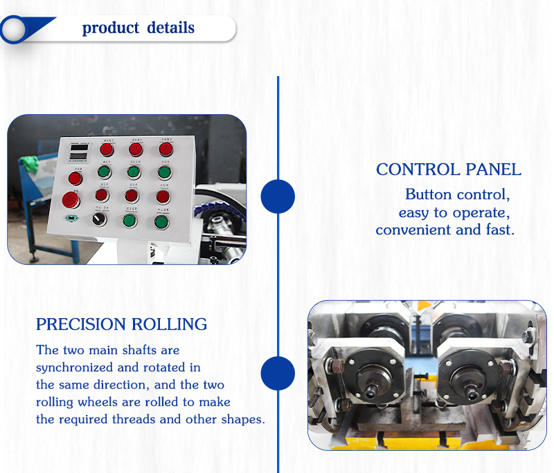 This machine is mainly used for rolling various types of precision external threads, high-strength standard parts, large-pitch anchor bolts, T-shaped screws and other workpieces.